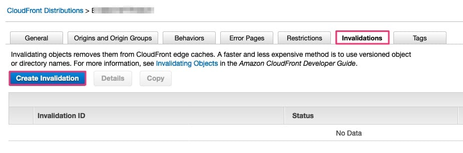 CloudFrontメニュー内の「Invaildations」タブを選択し、「Create Invaildtion」を選択します。