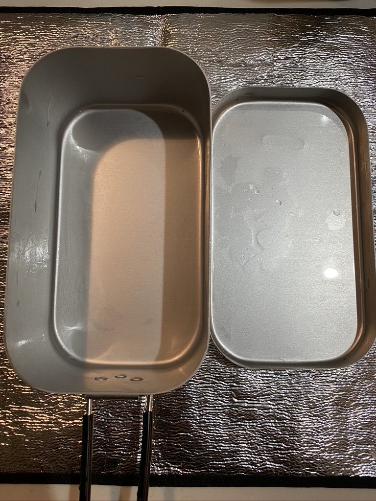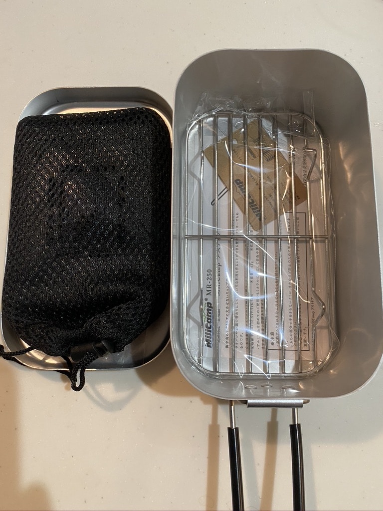 私の購入したメスティンはセットで網(蒸し物、燻製で使用)と固形燃料をセットする土台がセットになっておりました。