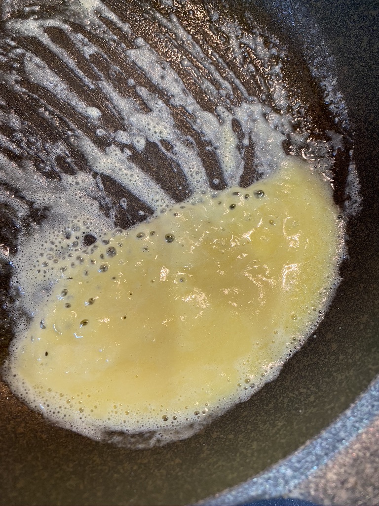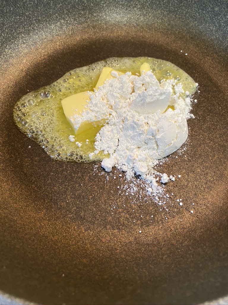 続いてフライパンにバター30gと小麦粉30gを入れて弱火で火を入れて混ぜていきます。
