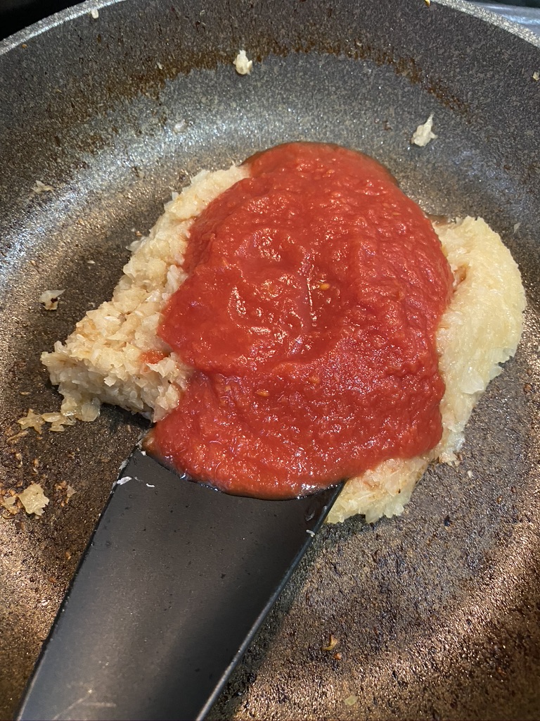 続いてあらごしトマト缶150gを入れて混ぜます。