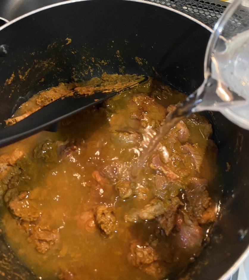 続いて水550mlとマギーブイヨン5個(よく砕いてから)、フルーツチャツネ大さじ2を入れます。