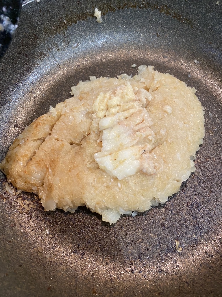 あまり飴色になっていませんが、炒め終わったらにんにくすりおろし10gとしょうがすりおろし10gを入れます。