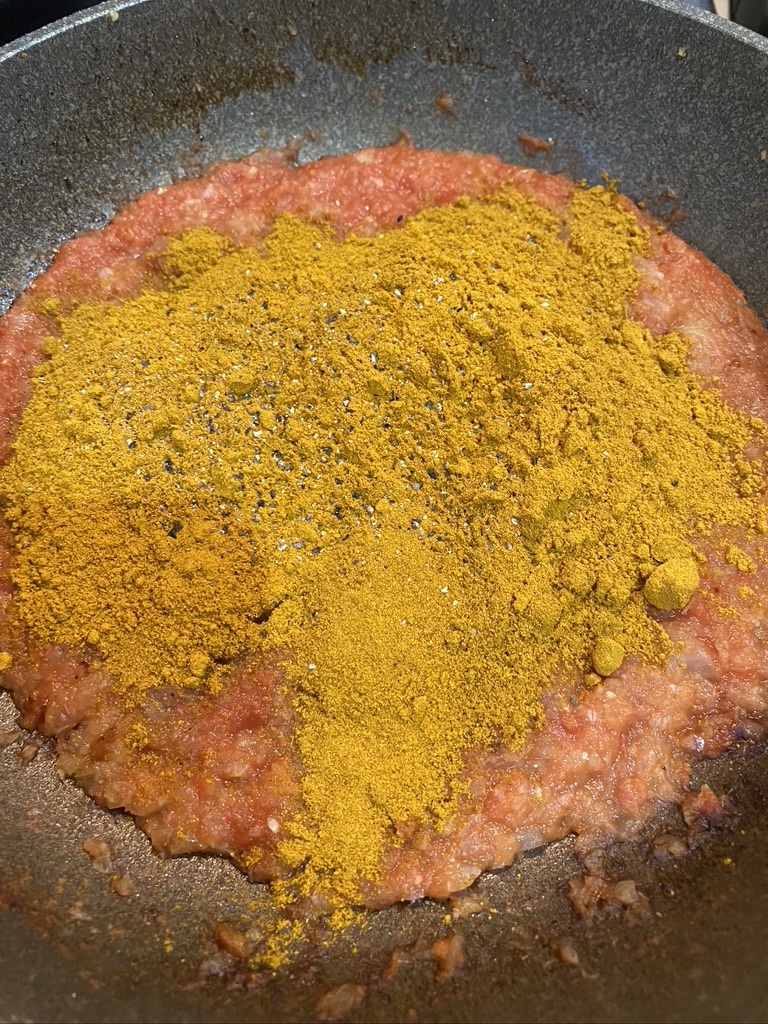 2分ほど混ぜて炒めてからインデアンカレー大さじ3とインデラカレー大さじ2とブラックペッパー少々(ミルだと4回挽くくらい)入れてよく混ぜます。